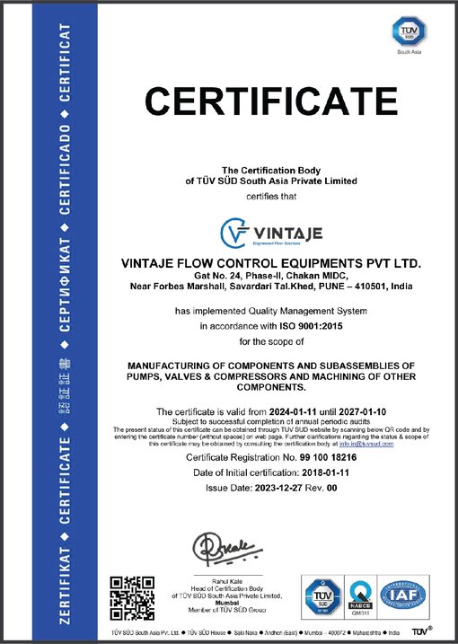 At Vintaje Flow Control, we uphold our core philosophy of Sincerity, Quality, and Service. Certified under ISO 9001:2015 by TUV SUD South Asia, we ensure globally recognized quality standards that enhance our credibility and competitiveness.Every component undergoes stringent quality checks from procurement to final delivery. Our processes and methods are continually monitored and improved to achieve complete customer satisfaction. We maintain strong, transparent relationships with our customers and suppliers, fostering trust and efficiency.With state-of-the-art testing instruments and advanced manufacturing systems, we consistently deliver superior products with precision, performance, and reliability.